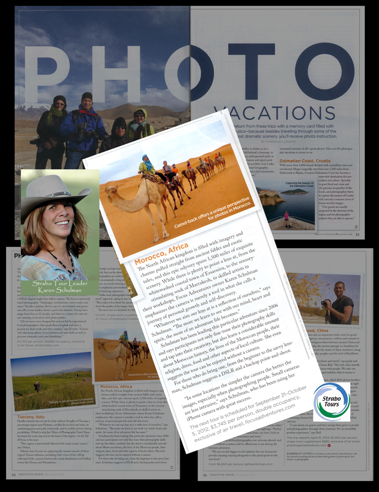 Kiplinger's Retirement Report in June, 2002, and Writer's Digest new magazine, Successful Photography, April 2003. Additionally, Focus Adventures has been chosen by Colorado Meetings and Events magazine (Spring/Summer 2005) as one of the top 15 unique experiences for VIPs in Colorado. The May, 2006 issue of Shutterbug Magazine features an interview with Karen Schulman for the article, The Business of Travel Photography, by Maria Piscopo. Check out American Express' Executive Travel Magazine, March-April 2012 issue for an article entitled, Photo Vacations to read about their popular Morocco Photo Tours. Lastly, have a look at Karen's "Seeing Through iPhoneography" article in the Winter, 2014 issue of Photographer's Forum Magazine. We're sure it will open your eyes to new and creative photographic possibilities! |